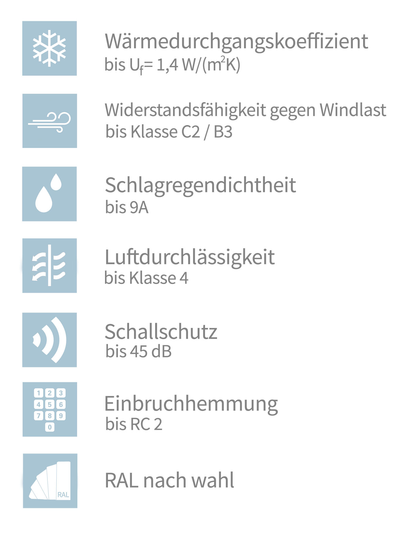 Mit durchgängiger Fünfkammer-Konstruktion, und dank geringer Bautiefe von 179 mm ist die PremiDoor 76 ideal für Renovierungen. Verglasungen sind bis zu einer Stärke von 50 mm einsetzbar. Schmale Ansichtsbreiten – 65 mm bei der Zarge, 100 mm beim Flügel und 103 mm am Mittelverschluss – sorgen für einen hohen Lichteinfall. Mit einem Uf-Mittelwert von 1,4 W/(m²K) weist die Neuheit bereits im Standard einen für Hebe-Schiebetüren hervorragenden Wärmedämmwert auf. Ein barrierefreies Schwellensystem gehört ebenfalls zur Standard-Ausstattung. Das System ist so aufgebaut, dass es sich einfach und wirtschaftlich nach Ihren individuellen Sicherheitsbedürfnissen – bis Widerstandsklasse RC 2 – ausstatten lässt.